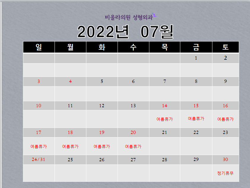 7월 휴진안내 작성자 관리자 작성일 2022-06-27 05:45 조회 321 7월 14일 부터 20일 까지 휴진합니다 (여름휴가) 좋아요 0 싫어요 0 인쇄 « ♡22년 여름휴가 안내♡ 8월 휴진안내 » 목록보기 답글쓰기 Powered by KBoard