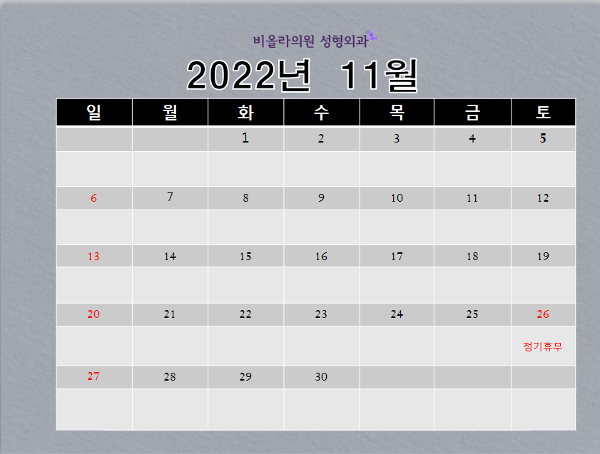 11월 휴진안내 작성자 관리자 작성일 2022-11-16 04:12 조회 392 마지막주 토요일 정기 휴무입니다~^^ 좋아요 0 싫어요 0 인쇄 « 10월 휴진 안내 목록보기 Powered by KBoard