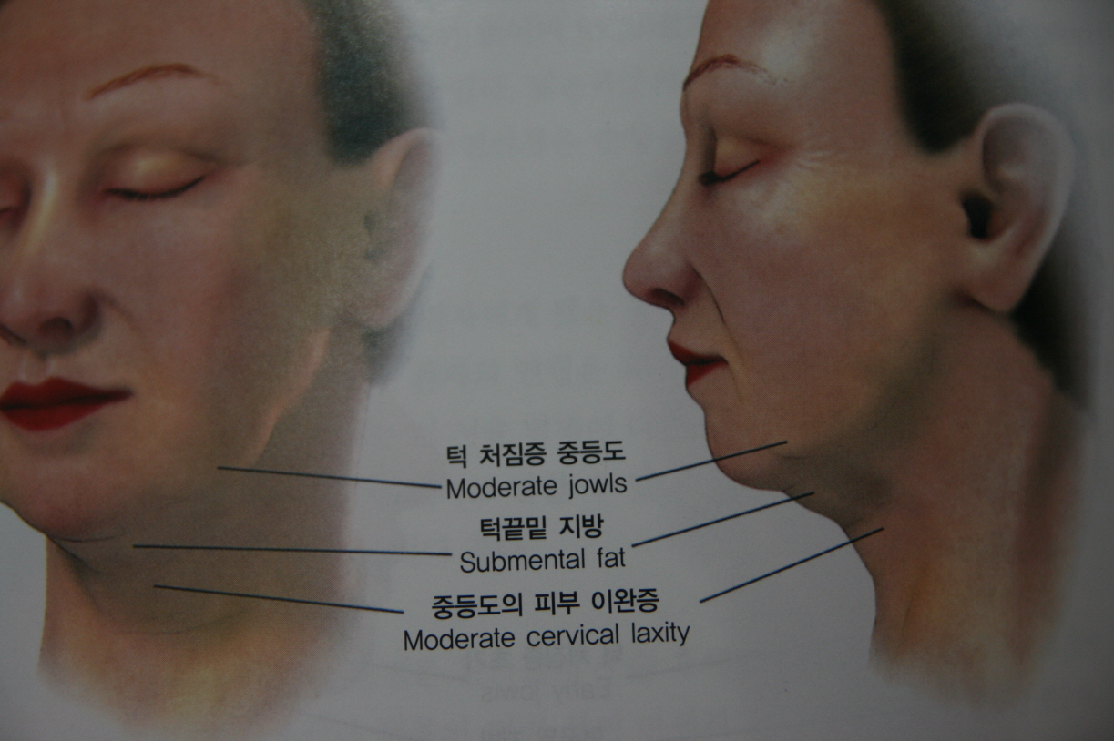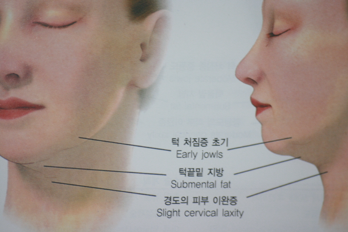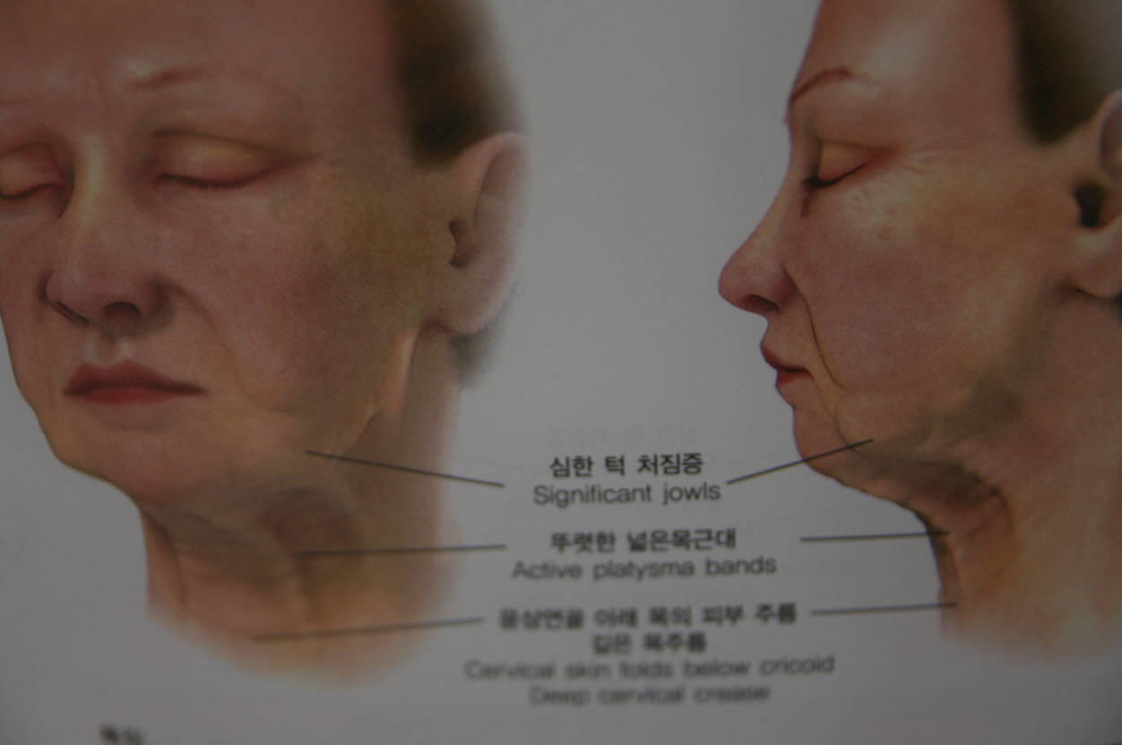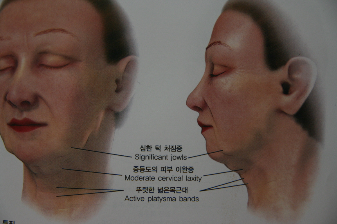 매우 심하게 턱살이 처지며 목주름이 깊어 져있다. 목 근육밴드가 뚜렷하게 보인다.